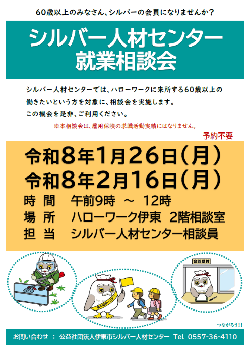 伊東市シルバー人材センターでは、ハローワーク伊東に来所する60歳以上の働きたいという方を対象に就業相談会を開催します。